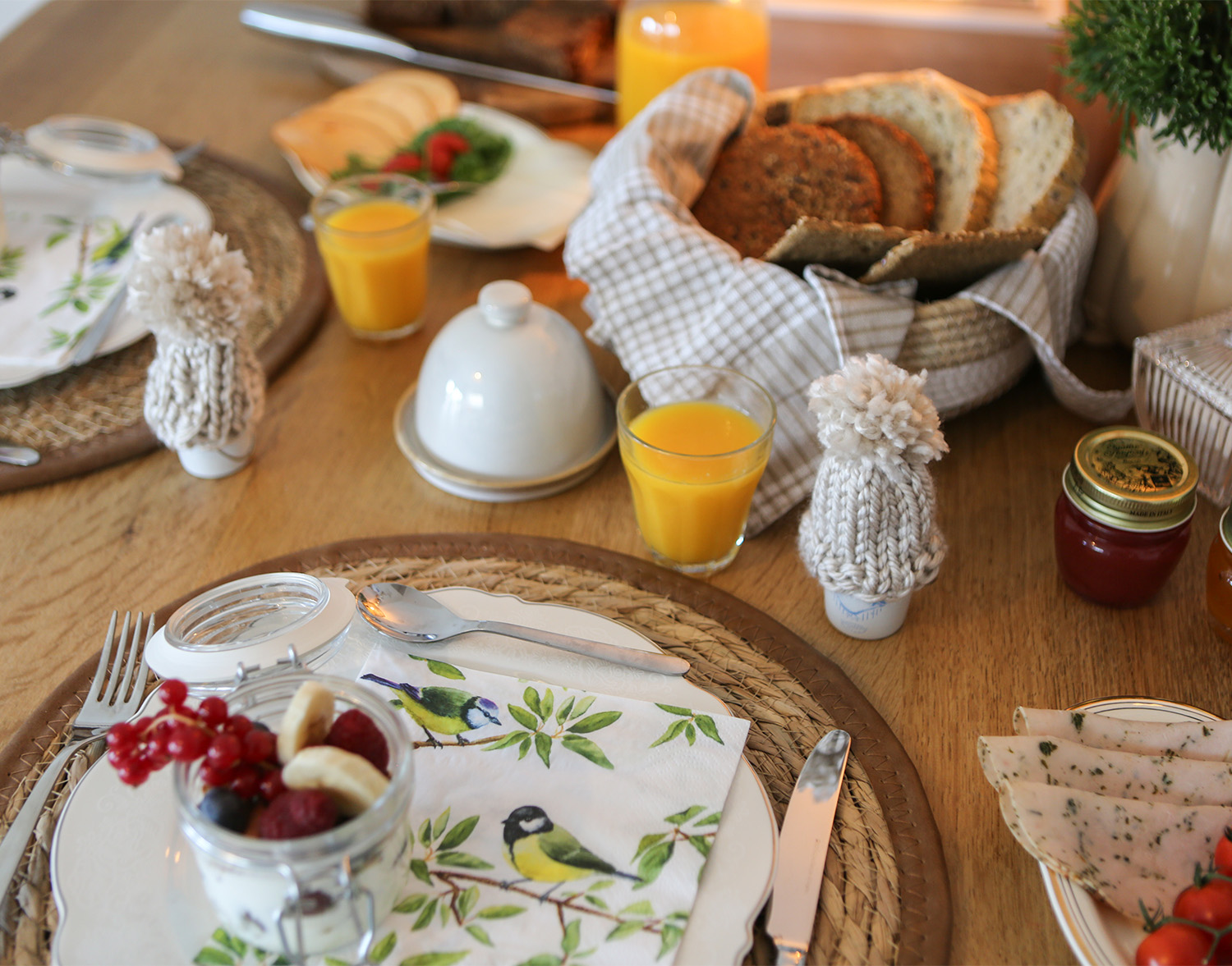 Bauernzwieback, Dinkelcracker, Butter, 2 Käsesorten, 2 Wurstsorten, 3 verschiedene hausgemachte Marmeladen, Erdnussbutter, Streusel, Joghurt, hausgemachtes Müsli, frisches Obst, Honig vom örtlichen Imker, Tomaten und Gurken. Und natürlich darf ein leckeres gekochtes Ei aus Freilandhaltung vom örtlichen Bauernhof nicht fehlen.